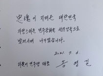 야권 대선 주자인 윤석열 전 검찰총장이 대권 도전 선언 후 공식 첫 대전일정을 국립대전현충원 참배로 시작했다. 6일 윤 전 총장은 현충탑 참배 후 방명록 작성 후 천안함 46용사와 한주호 준위 묘소, 연평해전 전사자 묘역 등을 차례로 방문했다. 방명록에는 "목숨으로 지..