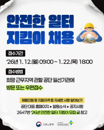 안전보건공단 대전세종광역본부(본부장 심우섭)는 22일까지 건설업·제조업 분야에서 활동할 '안전한 일터 지킴이'를 모집한다. 안전한 일터 지킴이는 산업현장에 대한 주기적인 순찰활동을 통해 중대재해를 예방하고, 취업취약계층을 대상으로 새로운 일자리를 창출하기 위한 전국 단..