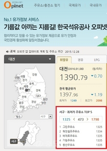 1월8일 현재 오피넷에 따르면 대전지역 휘발유 가격은 리터당 평균 1390원으로 전국 평균(1397원)보다 조금 낮다. 서구 최저가는 1325원(그린주유소), 유성구 최저가도 1325원(위성주유소)이다. 대덕구 1329원(한라석유), 중구 1329원(대웅에너지)이다...