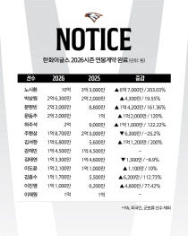 한화 이글스는 21일 재계약 대상자 62명에 대한 연봉계약을 완료했다. 대상자 중 팀 내 최고 연봉자는 노시환으로, 지난해 3억 3000만 원에서 6억 7000만 원 인상된 10억 원에 계약했다. 이는 팀 내 최고 인상률(약 203%)이자 최대 인상액이다. 투수 최고..