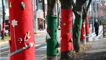 8일 대전 동구 중동의 한 거리에 있는 가로수에 뜨개옷이 입혀져 있어 시민들의 눈길을 끌고 있다. 이성희 기자 token77@