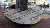 4일 대전 중구 태평동오거리에 설치된 그늘막 쉼터가 차량 추돌로 파손된지 한 달이 넘게 방치돼 있어 미관을 해치고 있다. 이성희 기자 token77@