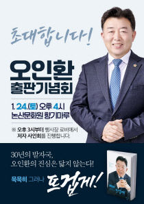 오인환 충남도의원이 자신의 30년 정치 철학과 미래 비전을 집약한 저서 『묵묵히 그러나 뜨겁게!』의 출판기념회를 열고 본격적인 소통 행보에 나선다. 이번 출판기념회는 오는 1월 24일(토) 오후 4시, 논산문화원 향기마루에서 개최된다. 본 행사에 앞서 오후 3시부터는..