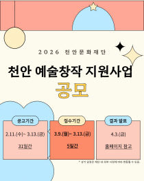 (재)천안문화재단이 '천안 예술창작 지원사업' 공모를 진행하기로 했다. 모집 분야는 전문예술인, 전문예술단체, 신진예술인, 신진예술단체, 생애 최초 지원, 신생예술단체, 생활예술동호회, 장애인, 전통문화예술 계승 등 총 9개 사업이다. 신청 대상은 공고일 기준 천안에..