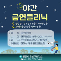 천안시 동남구보건소(소장 박혜경)가 11월까지 야간 금연클리닉을 운영한다고 8일 밝혔다. 야간 금연클리닉은 시간적 제약으로 금연클리닉 이용이 어려운 직장인 등을 위해 마련됐으며, 매주 월요일은 오후 8시까지 이용할 수 있다. 금연클리닉에 방문하면 금연상담사와의 면담을..