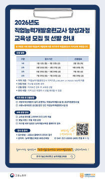 한국기술교육대학교 능력개발교육원(원장 이진구)은 23일까지 2026년도 첫 직업능력개발훈련교사 양성 과정 교육생 모집한다고 12일 밝혔다. 이번 모집은 연 4회(1월·3월·5월·7월) 진행되며, 차수별 선발 규모는 400명 내외다. 특히 인공지능(AI) 역량을 갖춘 훈..