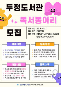 천안두정도서관이 책 읽는 공동체 형성을 위해 독서동아리를 모집한다고 30일 밝혔다. 모집 대상은 독서를 비롯해 토론, 필사, 글쓰기 등을 하는 성인 동아리로, 매월 1회 이상 정기모임을 갖는 4인 이상의 독서동아리다. 독서동아리로 선정되면 활동 장소 제공 및 동아리 홍..