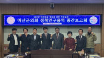 예산군의회(의장 장순관)는 25일 의회 문화강좌실에서 '예산군 자치법규 정비를 위한 연구모임' 정책연구용역 중간보고회를 개최했다고 27일 밝혔다. 이날 보고회에는 연구모임 대표의원인 김영진 의원을 비롯해 임종용·이길원·김태금 의원과 군청 관계자·외부 전문가 및 연구수행..