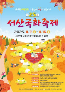 충남 서산시는 2025년 11월 7일부터 16일까지 서산시 고북면 복남골길 31-1 일원에서 제25회 서산국화축제를 성황리에 개최한다고 밝혔다. 이번 축제에는 한반도 지도정원, 달팽이 전망대 대형하트, 동물 토피어리 광장, 꽃탑 등 다양한 테마 조형물과, 석부작·현애국..