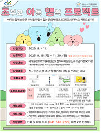 아산시가족센터(센터장 우정민)는 11월까지 조손가정의 의사소통 향상 및 삶의 질 향상을 위해 '2025년 조부모·아동 행복 프로젝트'를 추진한다. 사업 대상은 아산시에 거주하는 신규 조손가정이며 손자녀·조부모 웰컴키트 제공과 조손가정 대상으로 하는 나들이 지원으로 구성..