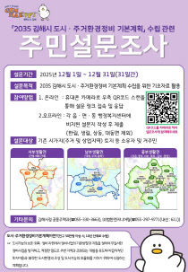 김해시는 오는 12월 1일부터 31일까지 2035 도시·주거환경정비 기본계획 수립을 위한 주민 설문조사를 실시한다고 밝혔다. 총 21문항으로 구성된 이번 조사는 주민 거주 형태 조사 및 환경 만족도에 관한 사항, 도시·주거환경 정비 기본계획의 관심도와 재건축·재개발 등..
