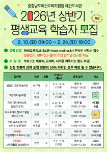 예산교육지원청 예산도서관(관장 조은숙)은 지역 주민의 자기계발과 평생학습 기회 확대를 위해 '2026년 상반기 평생교육 프로그램' 학습자를 모집한다고 10일 밝혔다. 이번 프로그램은 유아, 초등학생, 성인을 대상으로 총 7개 강좌가 운영되며, 독서·예술·AI 활용·자격..