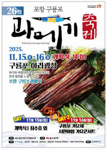 경북 포항시는 15, 16일 국내 최대 과메기 생산지인 구룡포 아라광장 일원에서 '제26회 포항 구룡포 과메기 축제'를 연다. 지역 특산물인 과메기의 소비 촉진과 지역경제 활성화를 위해서다. 축제 기간 동안 신선한 구룡포 과메기를 시중보다 저렴하게 구매할 수 있는 할인..