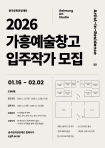 (재)충주문화관광재단이 충주공예전시관 레지던시 '가흥예술창고' 4기 입주작가를 2월 2일까지 공개 모집한다. 모집 대상은 시각예술 전 분야로, 본 레지던시 입주경력이 없는 작가라면 누구나 지원할 수 있다. 모집 인원은 6명 내외로, 입주 기간은 3월부터 11월까지 9개..