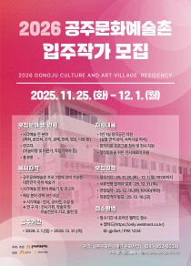 (재)공주문화관광재단이 운영하는 공주문화예술촌이 2026년도 레지던시 프로그램에 참여할 10기 입주작가를 모집한다. 공주문화예술촌은 시각예술 전 분야의 작가와 연구자를 위한 창작·제작 공간으로, 레지던시 프로그램 운영과 창작 공간 제공 등을 통해 안정적인 예술 활동을..