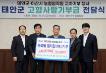 고향사랑기부제 활성화에 앞장서고 있는 NH농협이 태안군과 아산시 간 고향사랑기부금 상호기부에 나서 지역사회에 따뜻한 감동을 선사했다. NH농협 아산시지부(지부장 이규황)는 지난 21일 태안군청 중회의실에서 '태안군·아산시 농협 임직원 고향사랑기부금 전달 행사'를 갖고..