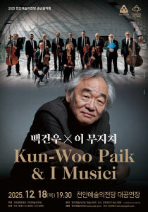 천안문화재단 천안예술의전당(관장 정승택)이 12월 18일 대한민국을 대표하는 피아니스트 백건우와 이탈리아의 전설적인 실내악단 이 무지치(I Musici)가 함께하는 송년음악회를 개최한다고 밝혔다. 이번 공연은 한국과 이탈리아 클래식계를 대표하는 두 거장이 처음으로 한..