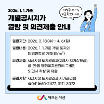 충남 서산시가 2026년 1월 1일 기준으로 산정한 개별공시지가에 대해 시민 의견 접수에 나선다. 서산시는 총 33만 8,821필지의 개별공시지가를 3월 18일부터 4월 6일까지 열람할 수 있도록 하고, 토지소유자와 이해관계인의 의견을 접수한다고 밝혔다. 개별공시지가는..