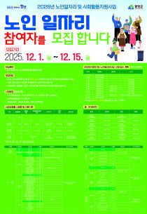 경남 함양군은 12월 1일부터 15일까지 '2026년 노인일자리 및 사회활동지원사업' 참여자를 모집한다고 밝혔다. 군은 내년 사업 참여 규모를 2423명으로 설정했다. 공익 활동과 역량 활용, 공동체 사업단 등 3개 유형에서 선발한다. 군은 지난해보다 153명 늘어난..