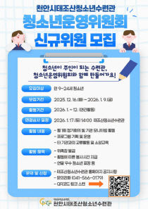(재)천안시청소년재단(대표이사 직무대행 김응일) 천안시태조산청소년수련관이 2026년 1월 9일까지 2026년 청소년운영위원회 신규 위원을 모집한다고 밝혔다. 청소년운영위원회는 청소년활동진흥법에 근거한 청소년 참여기구로, 청소년이 직접 수련관의 프로그램과 시설, 운영 전..