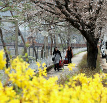 전국에서 봄꽃의 향연이 바람 따라 흩날리는 가운데 3일 현재 괴산읍 동진천변 산책로에도 노랗게 물든 개나리 뒤편 산책로를 따라 연분홍빛 벚꽃이 꽃망울을 터트리기 시작하며 나들이객들의 발길이 이어지고 있다. 동진천은 화사한 봄꽃과 함께 음악분수, 미디어파사드, 오작교 등..