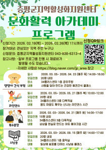 증평군이 지역주민 대상 19일부터 26일까지 생활 밀착형 문화·여가 프로그램'문화활력 아카데미'수강생을 모집한다. 34플러스센터에서 3월 3일부터 과정별 운영에 들어가는 이번 프로그램은 연령층, 생활패턴을 고려해 주간과 야간으로 나눠 진행된다. 주간 과정에서는 민화·서..