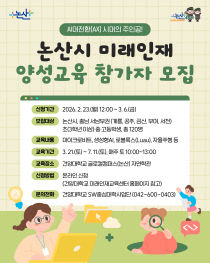 논산시(시장 백성현)가 디지털 대전환 시대를 선도할 ‘미래형 지역 인재’ 육성에 박차를 가한다. 시는 2월 23일부터 3월 6일까지 ‘2026년 논산시 미래인재 양성교육’ 프로그램에 참여할 학생들을 모집한다고 밝혔다. 이번 교육은 지방 소멸 위기와 인재 유출에 대응하기..