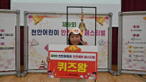 "시간 날때마다 틈틈히 공부했어요" 제9회 천안어린이안전체험페스티벌에서 퀴즈왕으로 선정된 신대초등학교 5학년 정호윤 학생이 우승 소감을 밝혔다. 신대초 같은반 동갑내기인 안예지 친구와 경쟁에서 '도로에 자동차의 통행을 방향별로 명확하게 구분하기 위하여 차도 중간에 황색..