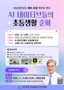 부산유아교육진흥원이 AI 시대 교육 패러다임 변화를 중심으로 예비 초등 학부모 연수를 실시한다. 부산시교육청 유아교육진흥원은 다음 달 4일 부산교육대학교 참빛극장에서 부산 시내 3~5세 학부모 400명을 대상으로 '예비 초등 학부모 연수'를 운영한다. 이 연수는 유아기..