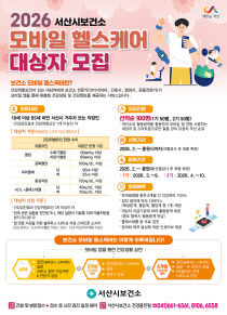 서산시가 시민들의 자가 건강관리 역량을 높이고 만성질환을 예방하기 위해 '2026년 모바일 헬스케어 사업' 참여자를 모집한다. 모바일 헬스케어는 간호사, 영양사, 운동 전문가 등 보건소 전문 인력이 모바일 앱을 통해 맞춤형 건강상담과 건강정보를 제공하는 비대면 건강관리..