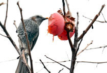 14일 대전 중구 태평동 주택가에서 직박구리 한 마리가 까치밥으로 남겨 놓은 감을 먹고 있다. 이성희 기자 token77@