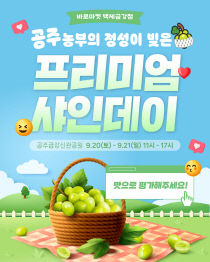 공주시 지역 포도 농가들이 20일과 21일 이틀 동안 금강신관공원 내 바로마켓 백제금강점에서 '프리미엄 샤인데이' 행사를 연다. 시에 따르면, 이번 행사는 공주에서 재배된 샤인머스켓을 비롯해 다양한 품종의 포도를 선보이며, 포도 농가의 판로 확대와 안정적인 정착을 위해..