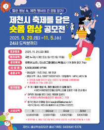 제천시는 오는 11월 21일까지 '제천시 축제를 담은 숏폼 영상공모전'을 개최한다. 이번 공모전은 '짧은 영상 속, 제천 행사의 긴 감동 담기'를 주제로, 2025 제천 국제 한방 천연물 산업 엑스포를 비롯해 제천에서 열리는 각종 행사와 축제의 현장을 창의적으로 담아낸..