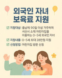 서산시는 지역 내 거주하는 모든 아동이 차별 없이 행복하게 성장할 수 있도록 외국인 자녀 보육료 지원 사업을 시작한다고 16일 밝혔다. 이번 지원 대상은 충남에 90일 이상 거주하고 있는 외국인 가정의 0~5세 자녀(국적 무관)이며, 서산 소재 어린이집 이용 시 보육료..