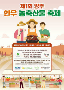 양주시가 양주축산농협(조합장 이후광)과 공동으로 주최하고, 경기도농수산진흥원 공모사업 지원으로 추진되는 제1회 양주 한우 농축산물 축제를 10월 25일부터 26일까지 이틀간 개최한다. 이번 축제는 양주 한우의 우수성을 널리 알리고 지역 농축산물의 판로 확대를 지원하기..
