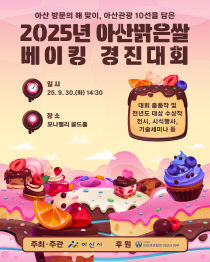아산시는 30일 지역 농산물 소비 촉진과 아산을 대표할 제과 제품을 개발하기 위한 '2025년 아산맑은 쌀 베이킹 경진대회'를 개최한다. 아산맑은 쌀과 지역 특산물을 활용해 창의적인 제과 제품을 선보이는 이번 대회의 심사는 전문가 5명과 소비자 패널 5명으로 구성된 심..