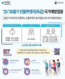 경북도는 다가오는 겨울철 인플루엔자 유행에 대비해 22일부터 내년 4월 30일까지 고위험군을 대상으로 2025년~2026년 절기 인플루엔자 국가 예방접종을 한다. 이번 접종은 생후 6개월부터 13세 어린이, 임신부, 65세 이상 어르신 등 인플루엔자 감염 시 중증화 위..