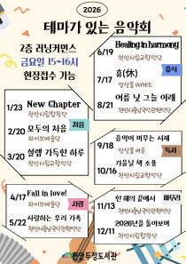 천안두정도서관이 2026년부터 '테마가 있는 음악회'를 운영한다고 밝혔다. 두정도서관은 매월 도서관 2층 러닝커먼스에서 5가지 테마로 음악회를 진행할 예정이다. '처음'을 테마로 1월 New Chapter, 2월 모두의 처음, 3월 설렘 가득한 하루 등으로 한 해의 시..