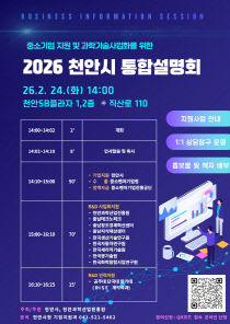천안시가 24일 천안SB플라자에서 천안과학산업진흥원과 함께 '중소기업 지원 및 과학기술사업화를 위한 2026 천안시 통합설명회'를 개최한다고 밝혔다. 이번 설명회는 시와 관련된 기관·단체에서 추진하는 중소기업 지원사업에 대한 종합정보를 제공하고, 과학기술사업화 유관기관..