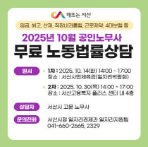 서산시는 근로자와 사업주를 대상으로 무료 노동법률상담을 운영한다고 9일 밝혔다. 이번 상담은 공인노무사가 직접 참여해 근로계약, 임금체불, 부당해고, 산업재해 등 다양한 노동 현안에 대해 전문적인 상담을 제공한다. 상담은 2회에 걸쳐 진행되며, 1차 상담은 10월 14..