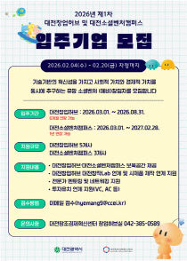대전창조경제혁신센터는 20일까지 2026년 1차 대전창업허브와 대전소셜벤처캠퍼스 입주기업을 모집한다고 밝혔다. 두 공간은 대전시가 지원하고 대전창조경제혁신센터가 운영하는 공간으로, 이번 입주기업 모집에선 대전창업허브 5개 사, 대전소셜벤처캠퍼스 3개 사를 각각 선발한다..