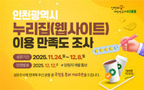 인천시가 시정정보 제공의 주요 창구인 시 대표 누리집의 이용자 만족도 조사를 11월 24일부터 12월 8일까지 총 15일간 실시한다. 이번 설문조사는 인천시 대표 누리집의 '시민참여 > 설문조사' 메뉴에서 진행되며, 인천시 누리집을 이용하는 시민이라면 누구나 참여할 수..