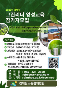 김해시는 탄소중립 생활 실천 문화를 확산하고 기후 위기에 대응할 전문가 양성을 위해 '그린리더 양성 교육' 참가자를 모집한다. 김해시는 탄소중립 선도단체 15명과 일반 시민 15명 등 총 30명을 선착순으로 모집해 오는 3월 24일부터 27일까지 나흘간 김해탄소중립체험..