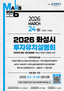 화성특례시(시장 정명근)는 24일 푸르미르 호텔에서 '2026 투자유치 설명회' 개최를 앞두고, 3일부터 18일까지 QR 코드 사전접수를 진행한다고 3일 밝혔다. 이번 설명회는 'MARS 2026 투자유치 & 컨퍼런스'와 연계해 사전접수를 완료한 기업을 비롯해 산업단지..