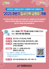 2025-11-22 인천 연수구, 2025 하반기 절세 전략 설명회 개최 인천시 연수구는 오는 12월 12일 오전 10시 구청 대회의실에서 유용한 세무 정보를 제공하는 '2025 하반기 절세 전략 설명회'를 개최한다. 최근 부동산 정책 변화와 잦은 세법 개정으로 세무 상담 수요가 증가하고, 고령화로 자산 이전에 대한 관심이 높아지고 있다...