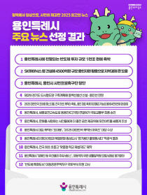 2025년 용인특례시(시장 이상일)를 빛낸 뉴스 가운데 '반도체 투자 규모 1000조 원 육박'에 시민과 언론인들이 1위를 선정했다고 29일 밝혔다. 특히 'SK하이닉스 팹 건설에 4500억 원 규모 용인 지역자원 활용'과 '용인시 시민 프로 축구단 창단'이 각각 2위..