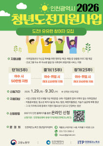 인천시는 오는 9월 30일까지 청년의 경제활동 참여와 노동시장 진입을 돕기 위해 2026년 청년도전지원사업 참여자를 모집한다고 23일 밝혔다. 이 사업은 구직단념청년, 자립준비청년, 가습기 살균제 피해 청년 등을 대상으로 심층 상담, 진로 탐색, 취업 역량 강화 등 맞..