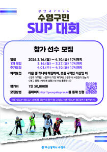 부산 수영구가 광안리 해변에서 열릴 '2026 수영구민 SUP 대회'의 참가자 140명을 모집한다. 이번 대회는 지역 주민의 해양스포츠 참여를 확대하고 해양레저 문화를 활성화하기 위해 지난 2022년부터 매년 개최되고 있다. 대회는 초등학교 4학년 이상의 수영구민을 대..