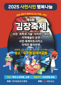 경남 사천시 우주항공테마공원에서 오는 13일 '2025년 제9회 사천시민 행복나눔 김장축제'가 열린다. 축제는 지역 봉사단체 한마음칠천포클럽이 주관하고 장기요양기관 연합회, 사천시 가족센터, 사천시 장애인 연합회, 사천소방서 등 지역 공동체가 함께 준비한다. 다양한 시..