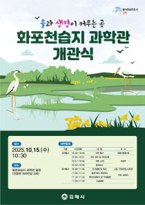 김해시가 다음 달 15일 화포천습지 과학관 개관식을 개최한다. 화포천습지 과학관은 국내 최대 하천형 배후습지인 화포천습지를 체계적으로 연구·보전하고 체험 학습하는 공간으로 마련됐다. 화포천습지는 멸종위기종 24종을 포함한 812종의 다양한 야생생물이 서식하는 '람사르습..